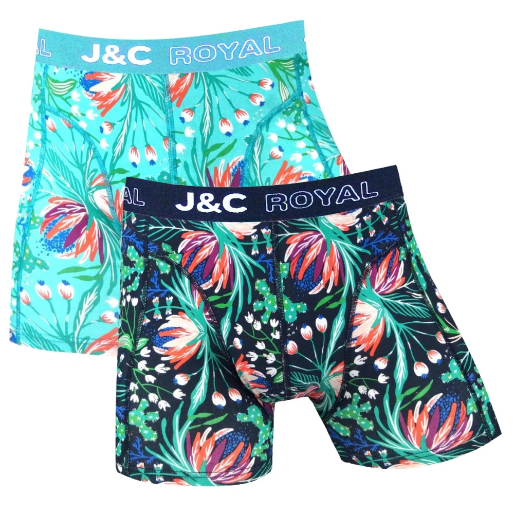 Breng kleur in je ondergoedcollectie met dit 2-pack J&C boxershorts voor heren. De combinatie van stretch katoen en een vrolijk bloemendesign maakt dit de ideale mix van comfort en stijl. De boxers hebben een aansluitende fit en blijven de hele dag perfect zitten, dankzij de stevige elastische band met het kenmerkende J&C Royal logo.